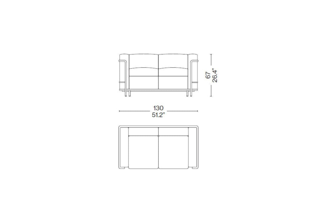 2 Fauteuil Grand Confort, Petit Modèle, by Cassina, is a sofa designed by Le Corbusier, Pierre Jeanneret and Charlotte Perriand in 1928 with a minimalist and functional line. Structure in shiny trivalent chromed steel (CR3) or painted semi-gloss grey, light blue, green, brown, mud, ivory or black. Loose cushions with polyurethane foam and polyester padding or feather padding with polyurethane core. Leather or fabric upholstery.