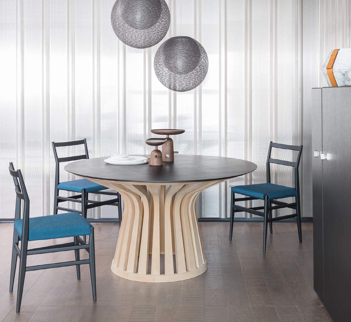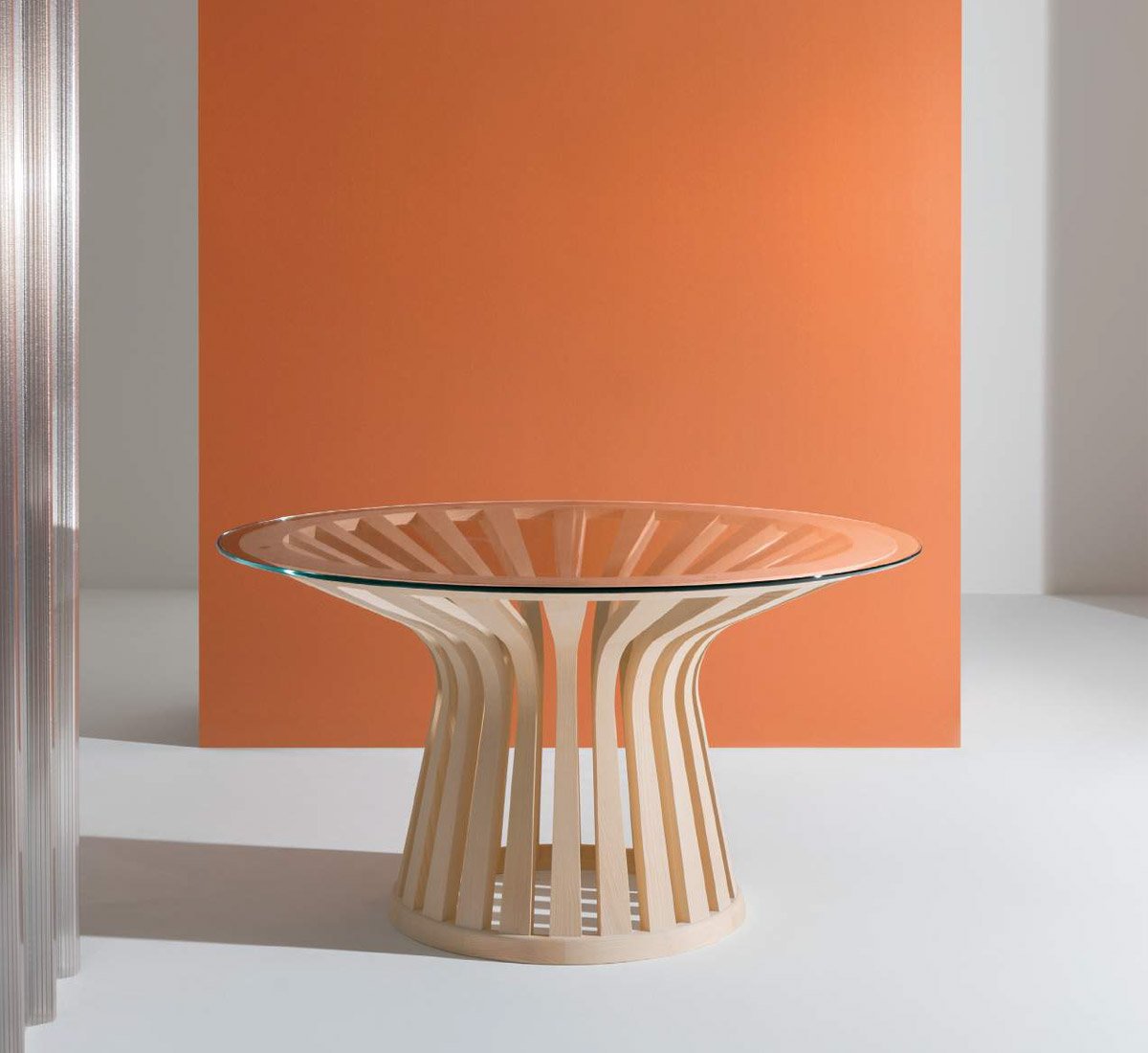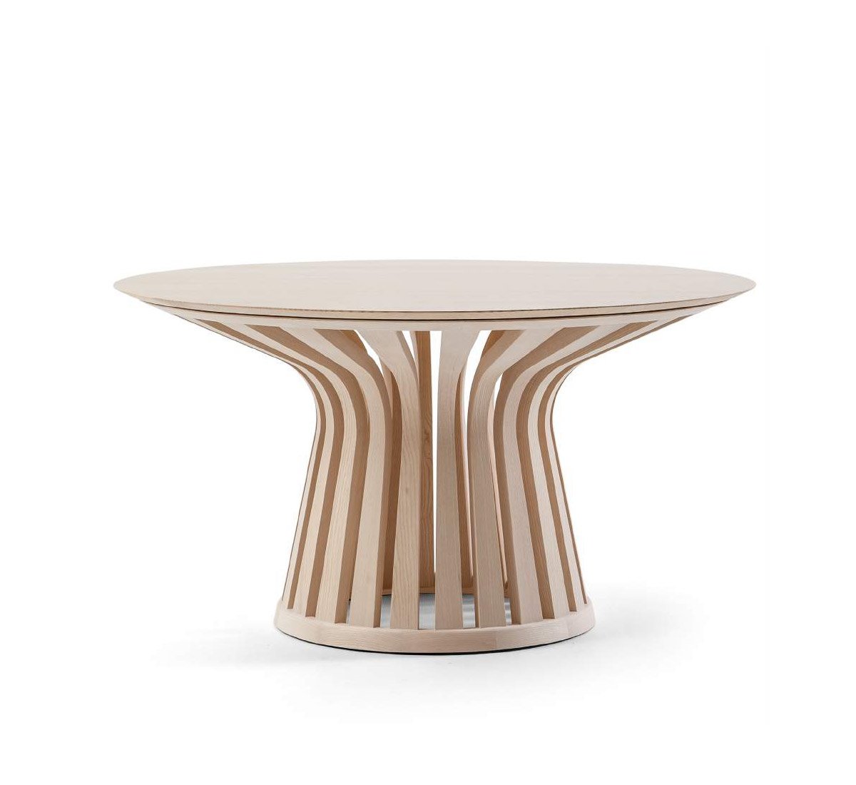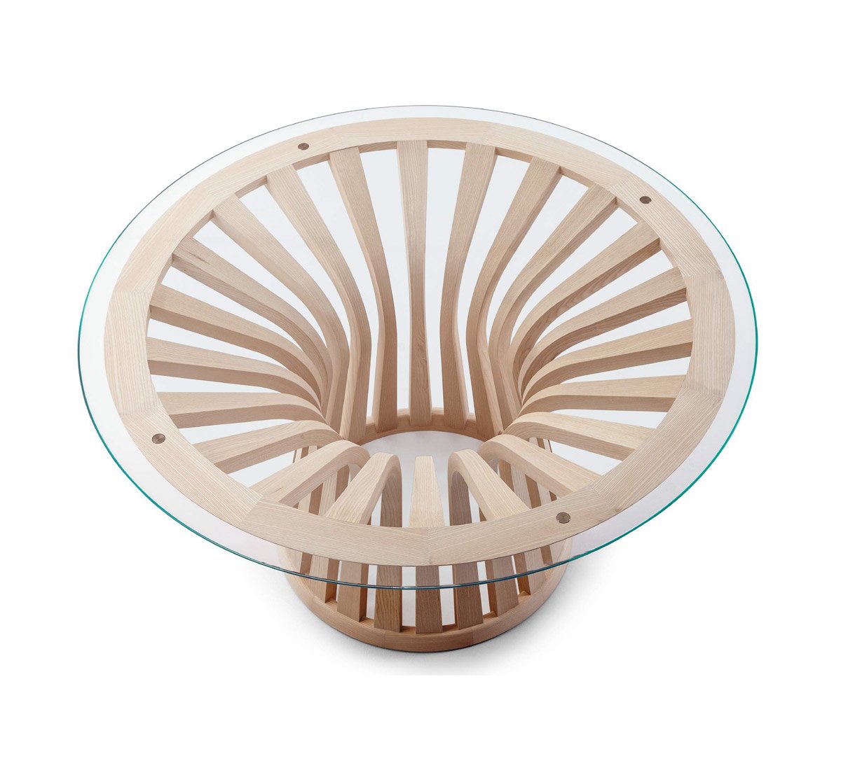 Workmanship with the most modern and sophisticated machinery is combined with the manual skill of the craftsmen who manage each stage of the table's production. The base, entirely made of solid ash wood, consists of 22 slats, worked from curved solid ash wood; the slats join two crowns, also made of solid ash wood. The tops are available in two versions: in 12 mm thick extra-clear glass, Ø 140 and 160 cm or in the four finishes of solid ash, in a single size Ø 140 cm.