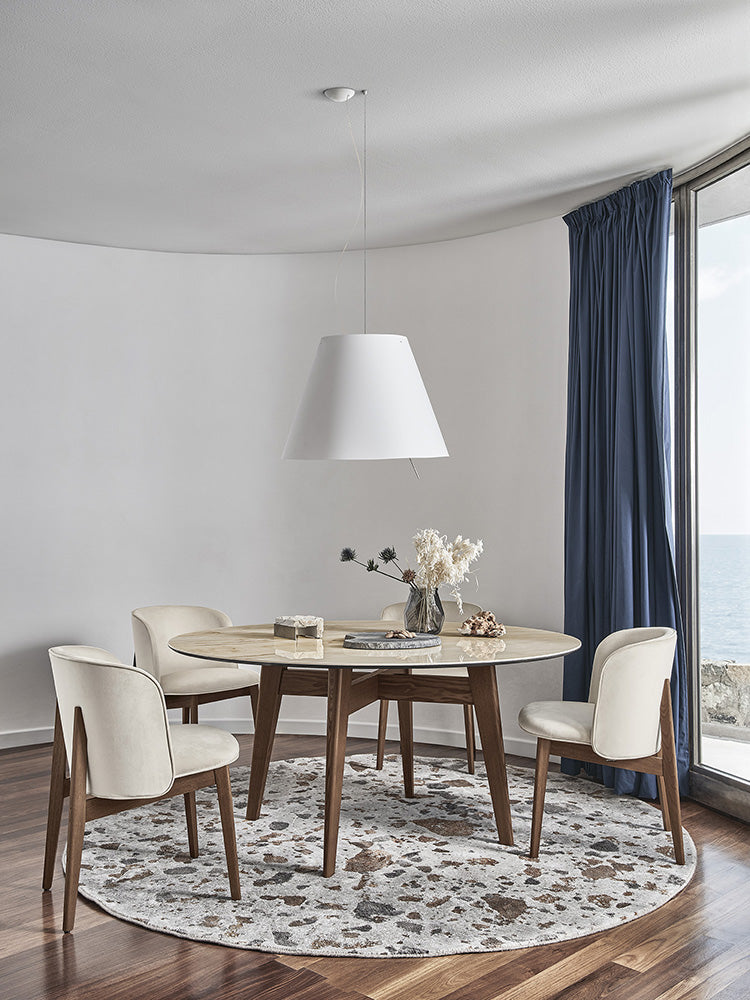 ABREY is an elegant sturdy non-extending table set on a round-section base in solid ash. The elegance of this table lies in a sheer simplicity of design that brings to the fore the rare beauty of the tops which differ in terms of size, shape and materials.