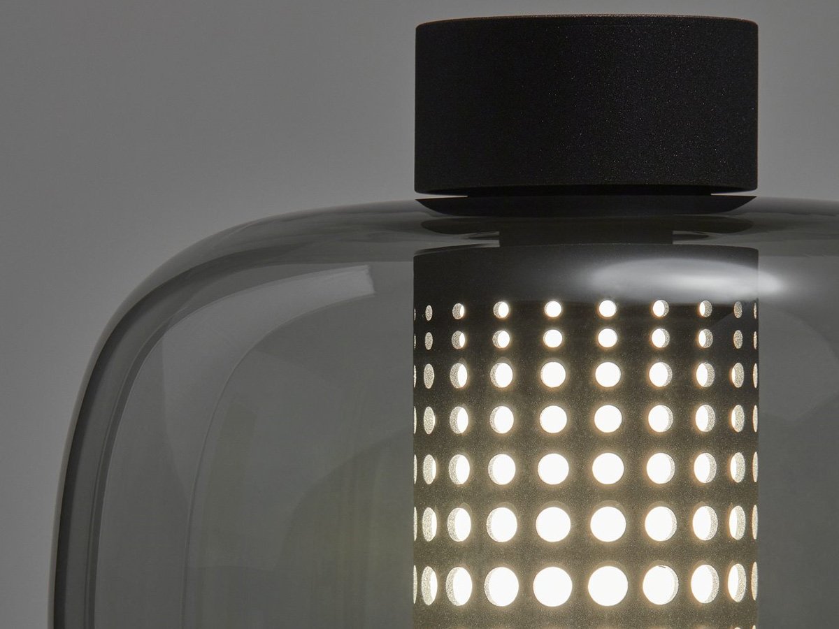The lamp draws inspiration from traditional Japanese paper lanterns, reflecting serene paths lined with light during festive times. With its charming smoked grey glass and matt black finish, it's perfect for creating a tranquil ambiance. Crafted with meticulous precision, the hand-blown glass shade elegantly diffuses the gentle LED light, highlighting the sophisticated craftsmanship involved. The lamp rests on a simply designed stainless steel base, coated with eco-friendly powder, ensuring sustainability meets style. Available in a harmonious blend of black and grey, this versatile lamp can seamlessly transition from a table lamp to a floor piece, offering convenience with an easy-to-use special connector developed by Brokis.