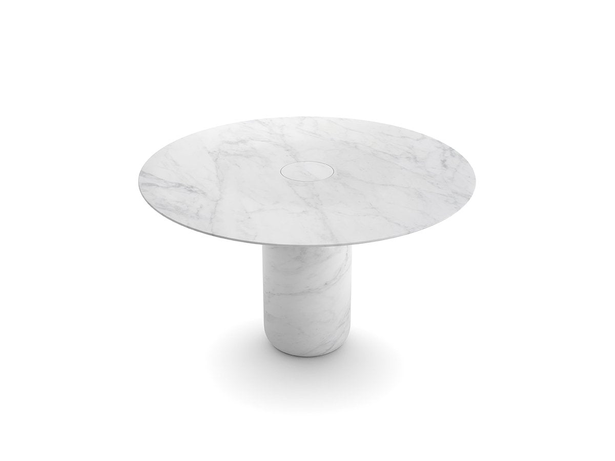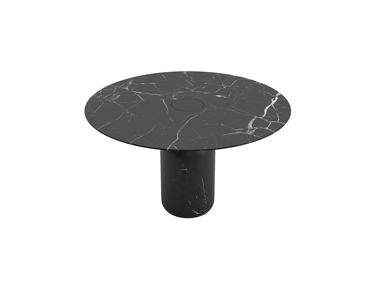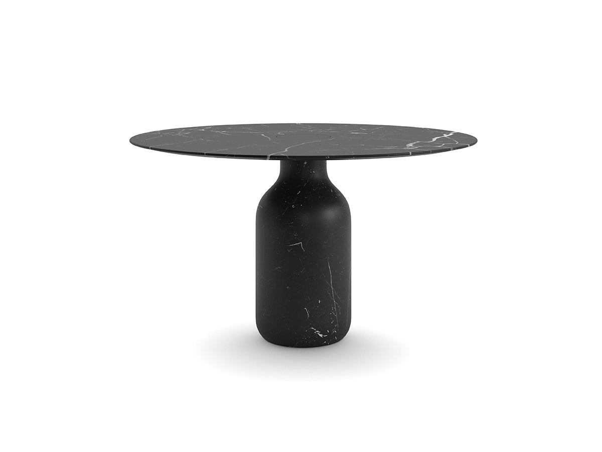 Bottle Table also joins the Cappellini catalog in a version with a round top, in the two fascinating variants Carrara white or Marquinia black. The fascinating texture of the natural stone enriches and enhances the minimal and sculptural design of the table, enhancing its volume and line. Particularly versatile because of its proportions, it is perfect for a refined and elegant setting in which to receive guests, albeit with reduced space availability.