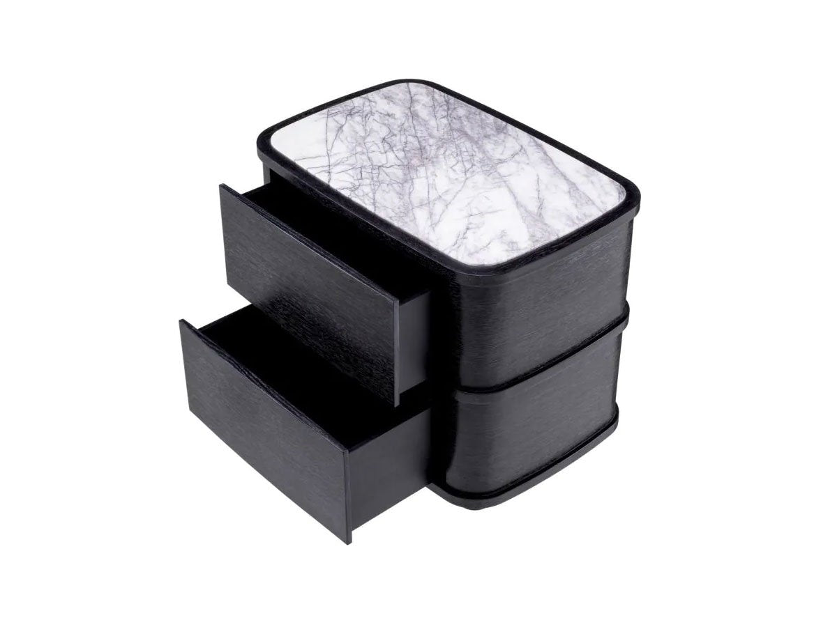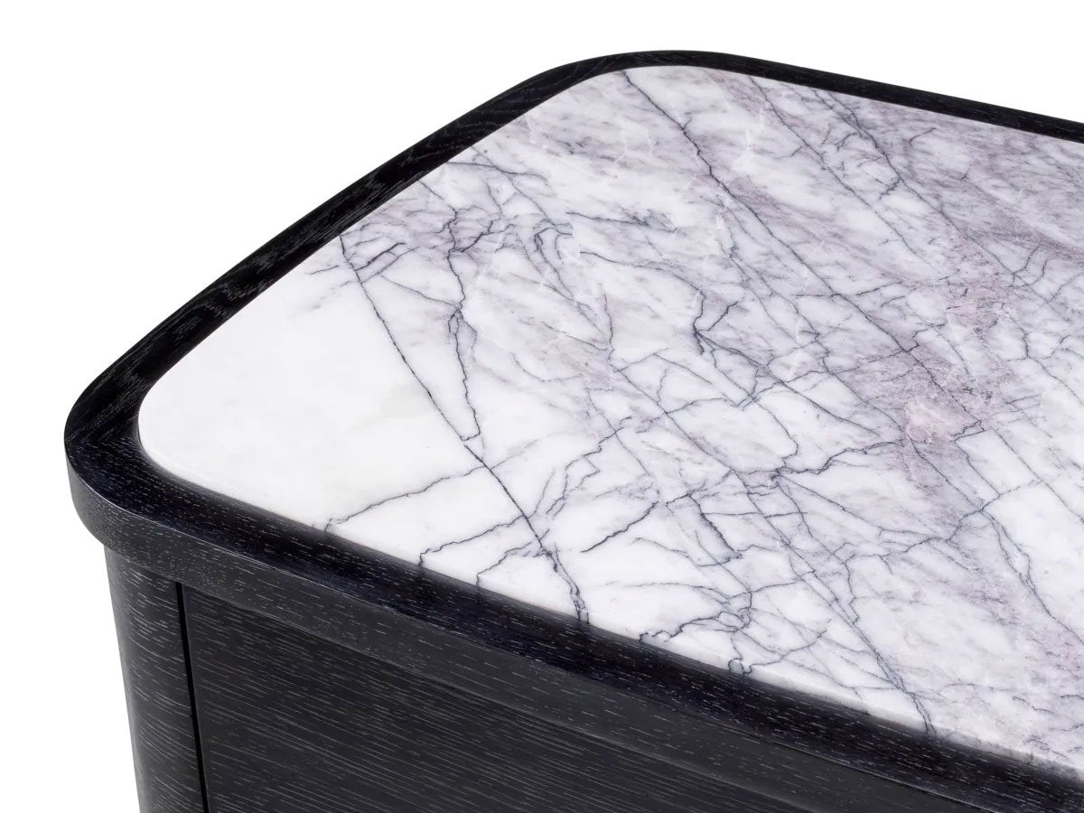 Cabana is a nightstand produced by the Eichholtz brand. The bedside table frame is made of gray oak veneer with a lilac white marble top, complete with two drawers.