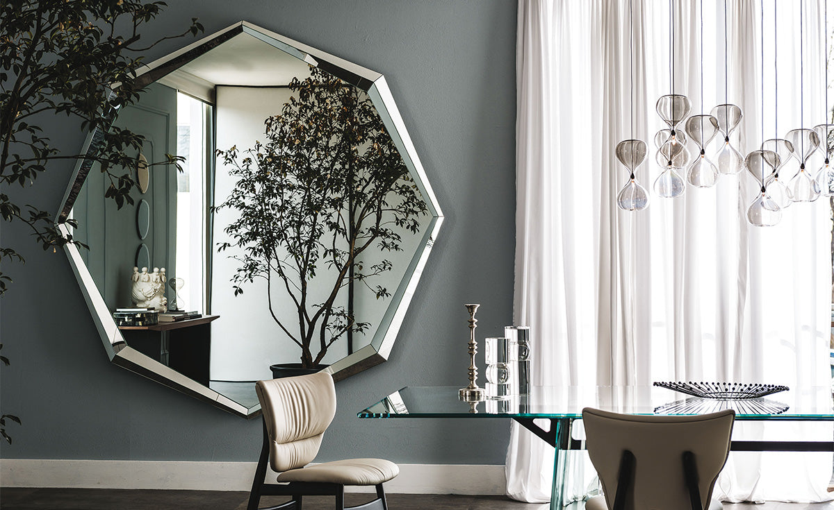 Emerald is a family of designer mirrors with a fully mirrored frame. With their sharp-cornered shape and three-dimensional frame, these mirrors are like precious stones, and as such, they reflect different views of the surrounding room. The large Emerald contemporary wall mirror is designed to decorate a wall while simultaneously expanding the room. Emerald is available in round or rectangular shapes or in the 2-metre-large Emerald Magnum version. To give the room a more intimate and sophisticated effect, Emerald can have a fumé glass mirror.