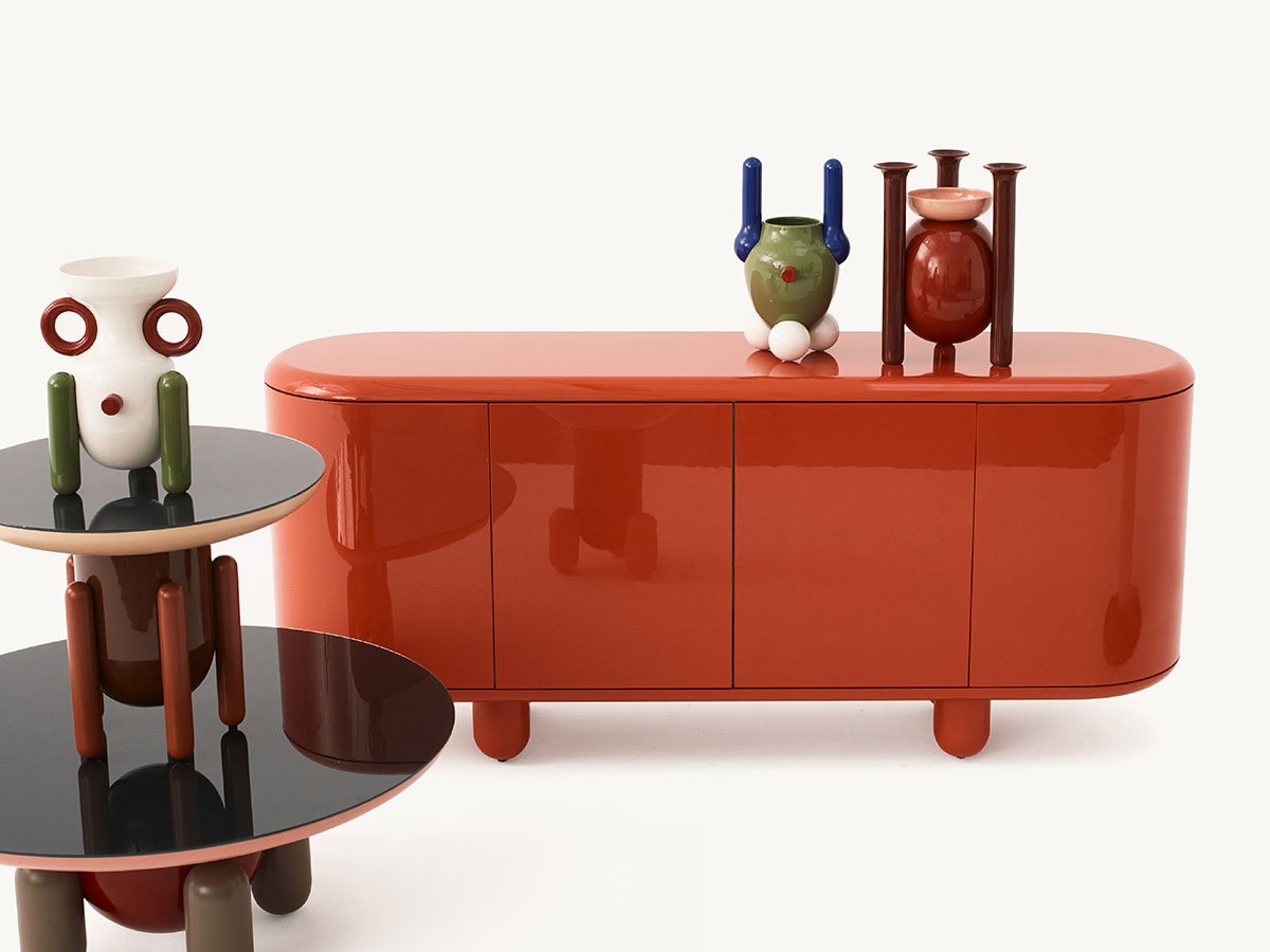 Jaime Hayon's design philosophy integrates a playful yet refined aesthetic, drawing inspiration from everyday items like a traditional hot dog. This humorous touch is balanced by the cabinet's modular structure, allowing it to adapt seamlessly into a room while maintaining its unique visual impact. The piece's astral quality is emphasized by its wooden legs and vibrant curves, offering a statement piece that stands out in both private and commercial spaces.