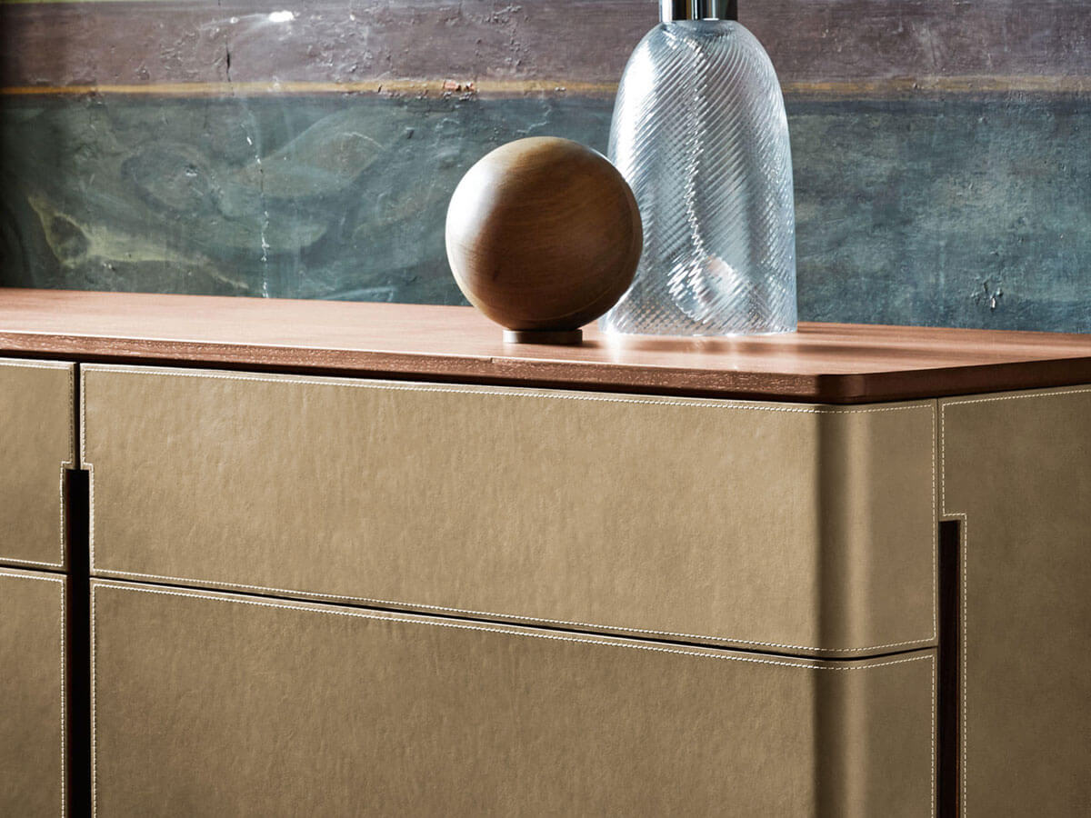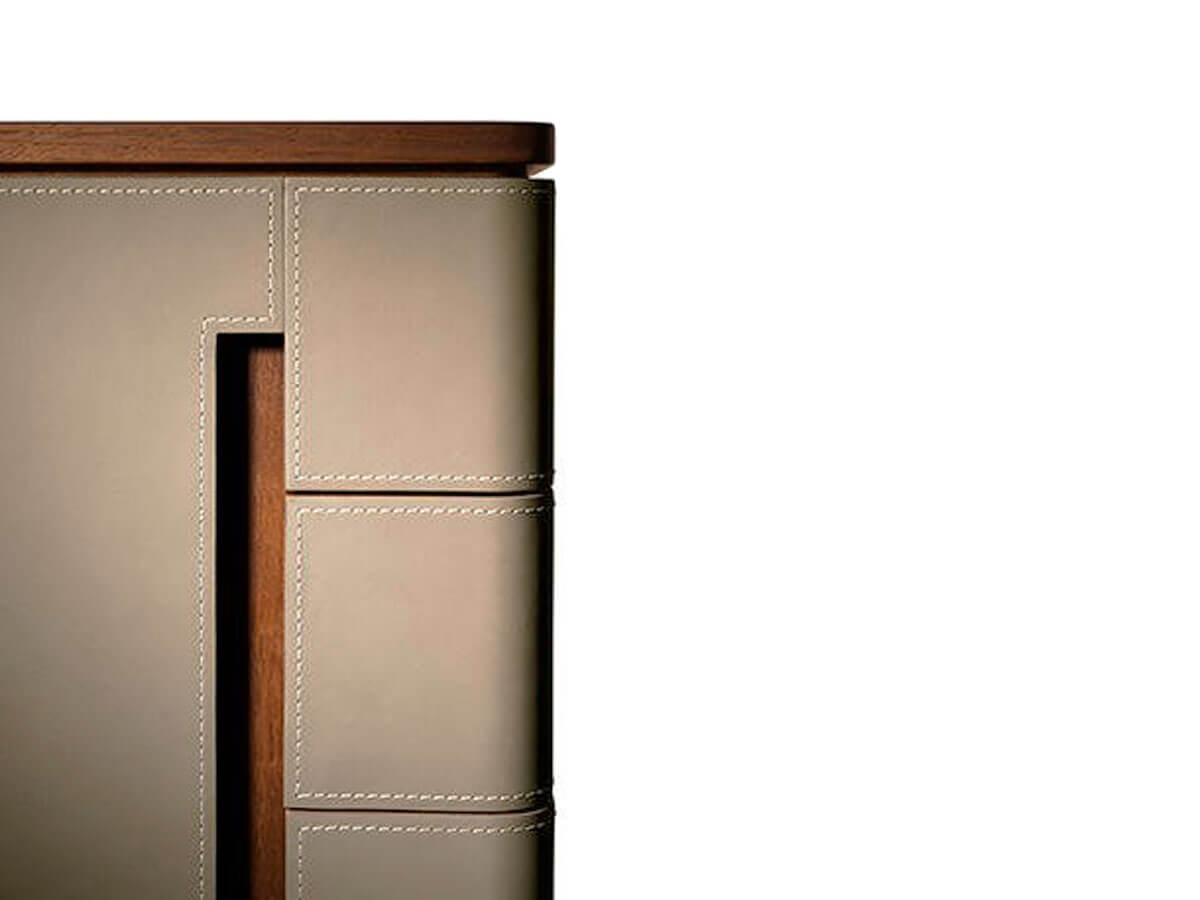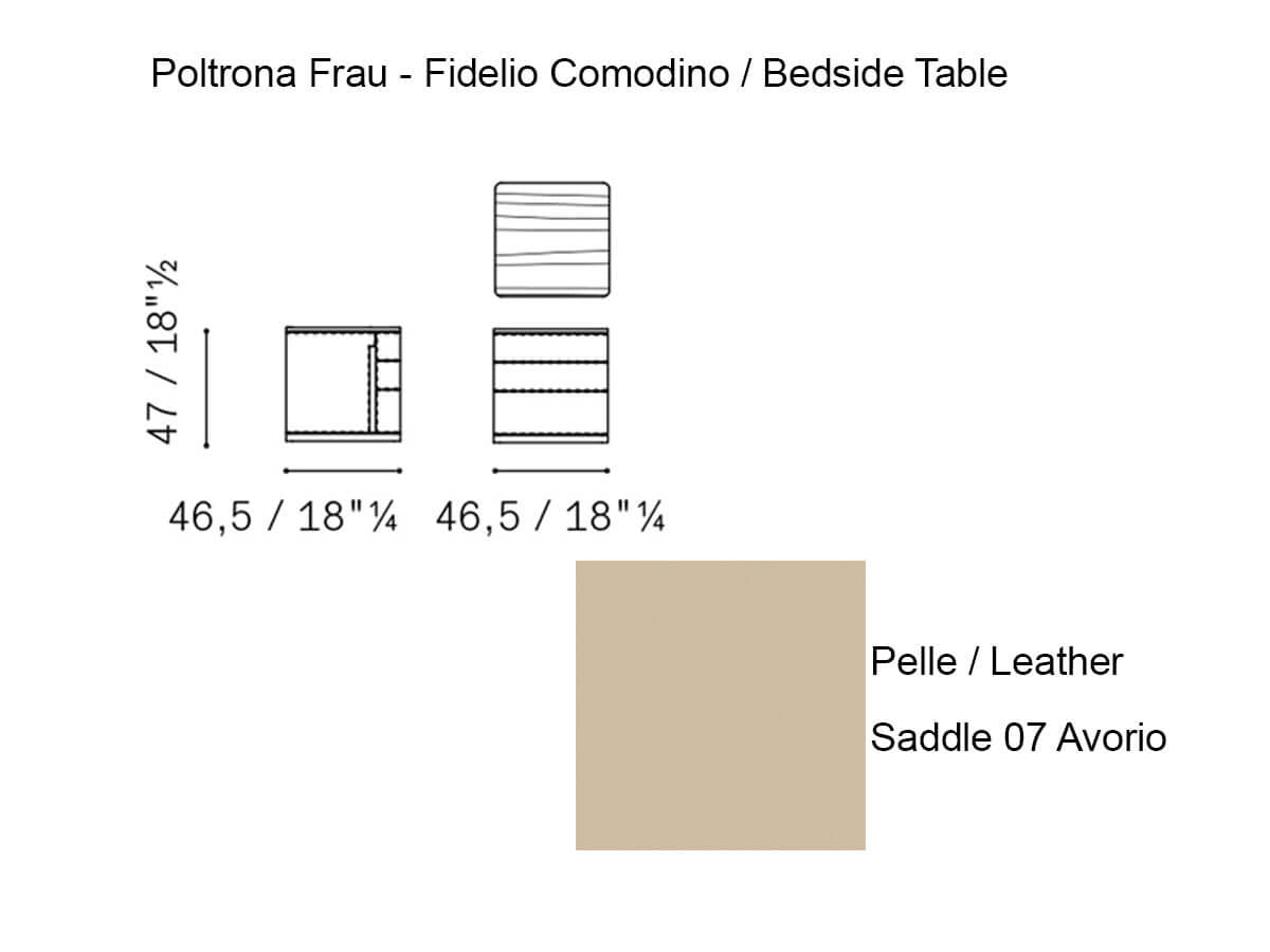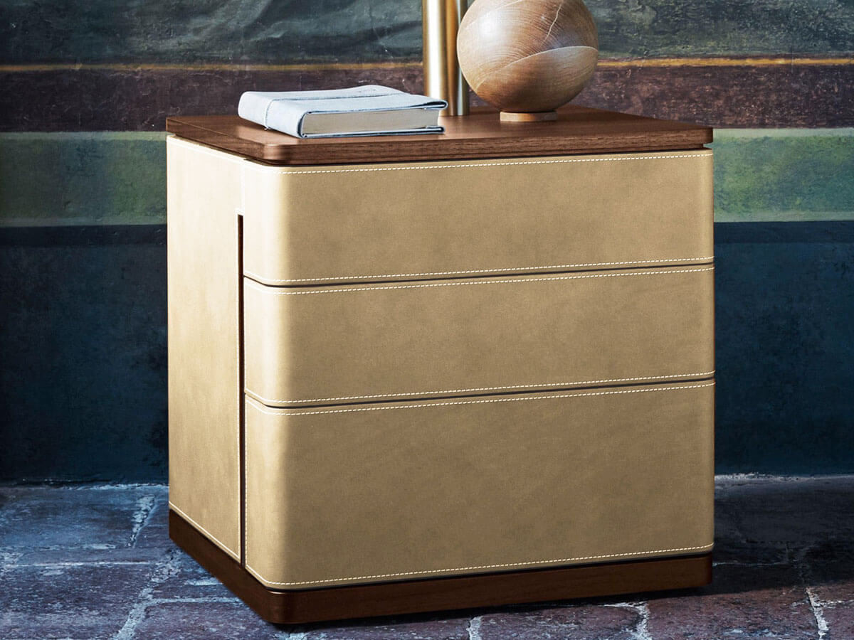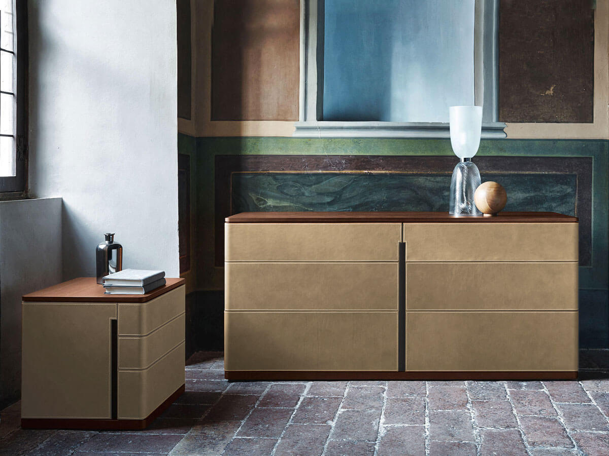 Fidelio Notte is thought for every need. The bedside table base is made of birch plywood with a Canaletto walnut veneer and is provided with adjustable steel feet with rubber caps. The drawers are mounted on metal soft-close runners. The sides, doors, internal drawers and, on request, the back are upholstered with saddle or saddle extra leather. The marble top is treated with a protective water-repellent solution which provides a more natural look. Choose it alone or combine it with the other elements of Fidelio Notte Collection.