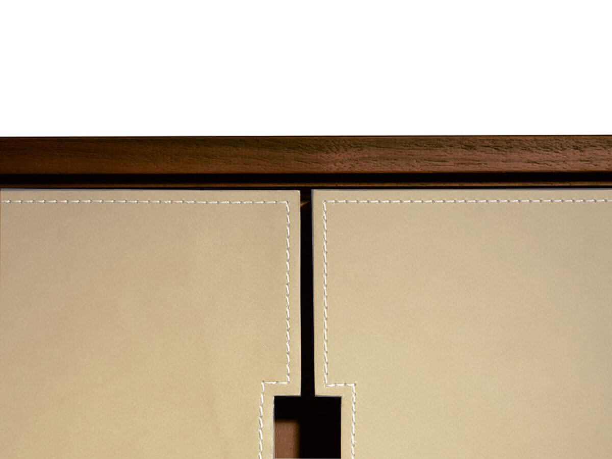 In this version: Canaletto walnut supporting structure (29) and a extra light natural maple (65) veneer on the inner side. Top and back side in canaletto walnut. 07 Avorio Saddle leather upholstery with tone-on-tone stitching.
