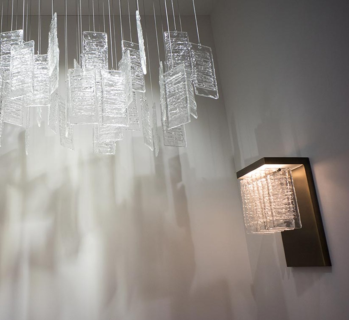 Ice is a lamp collection designed by Reda Amalou and produced by the brand Veronese Paris. Is made of steel and Murano glass. Ice originates from the fascination with designing an iconic piece of Murano glass that can metamorphose into diverse compositions, allowing for a perpetual creative process. With this objective in mind, Reda Amalou created a textured rectangular sheet of hand-laid Murano glass with a geometric, hand-pressed, pattern that catches the light and gently diffuses it. The ICE sheets are designed to gently dangle from its frame, whatever it may be.Light source: 3 LED x 16W