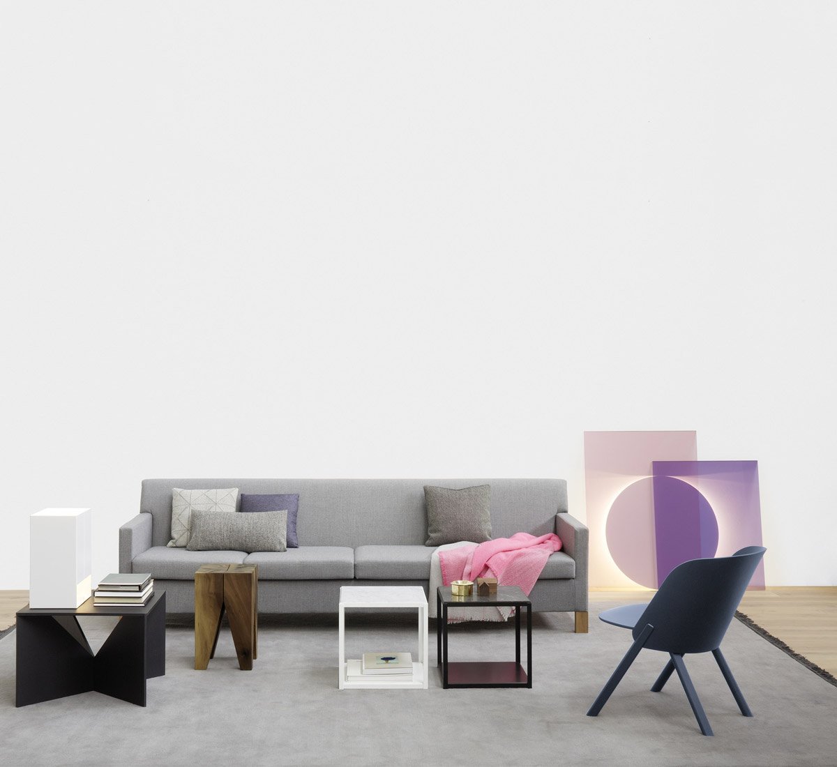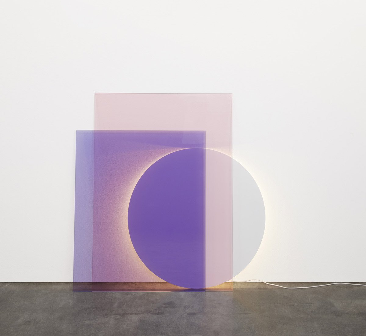 INFO Installation Location: Indoor Case Material: Steel, powder-coated; glass Light distribution: indirect diffused Cable: PVC, length 3000 mm, Switch 1000/2000 mm Light Source: LED permanently mounted Power: 19.2 W Luminous flux: 2000 lm Colour temperature: 4000 K, neutral white Color Rendering Index CRI: Ra 80 Index Energy Efficiency: A + The lamp is composed of a circular panel white and two rectangular panels blue and pink