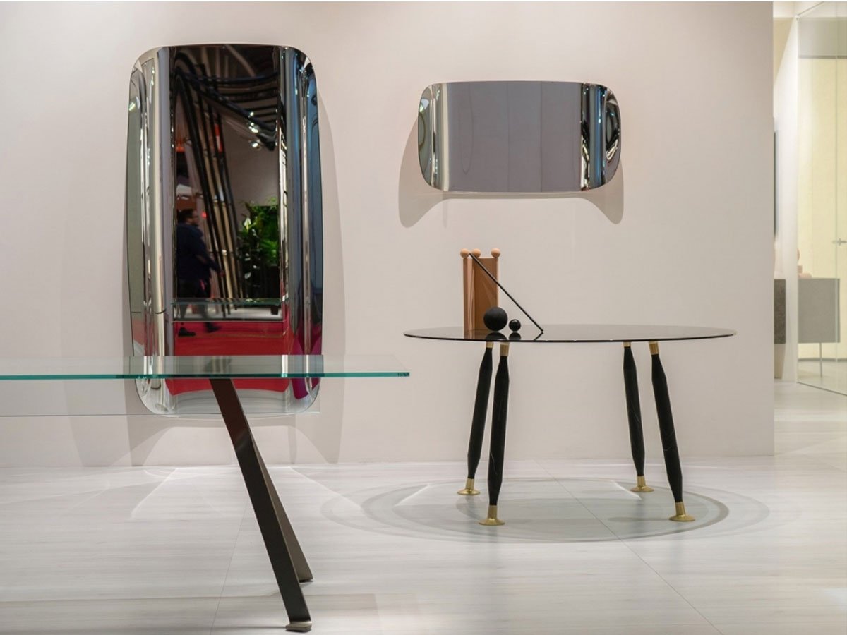Refined and suggestive, the wall mirrors are created by bending a slab of extra light 6 mm. glass, molded and shiny ground polished and then manually silvered. The image is faithfully reflected in the central part of the mirror, while the curved part of the surface distorts the reflection unexpectedly. Marlene fits perfectly into any type of space, in a bedroom above the chest of drawers, in an elegant bathroom, or in the entrance, next to a console.