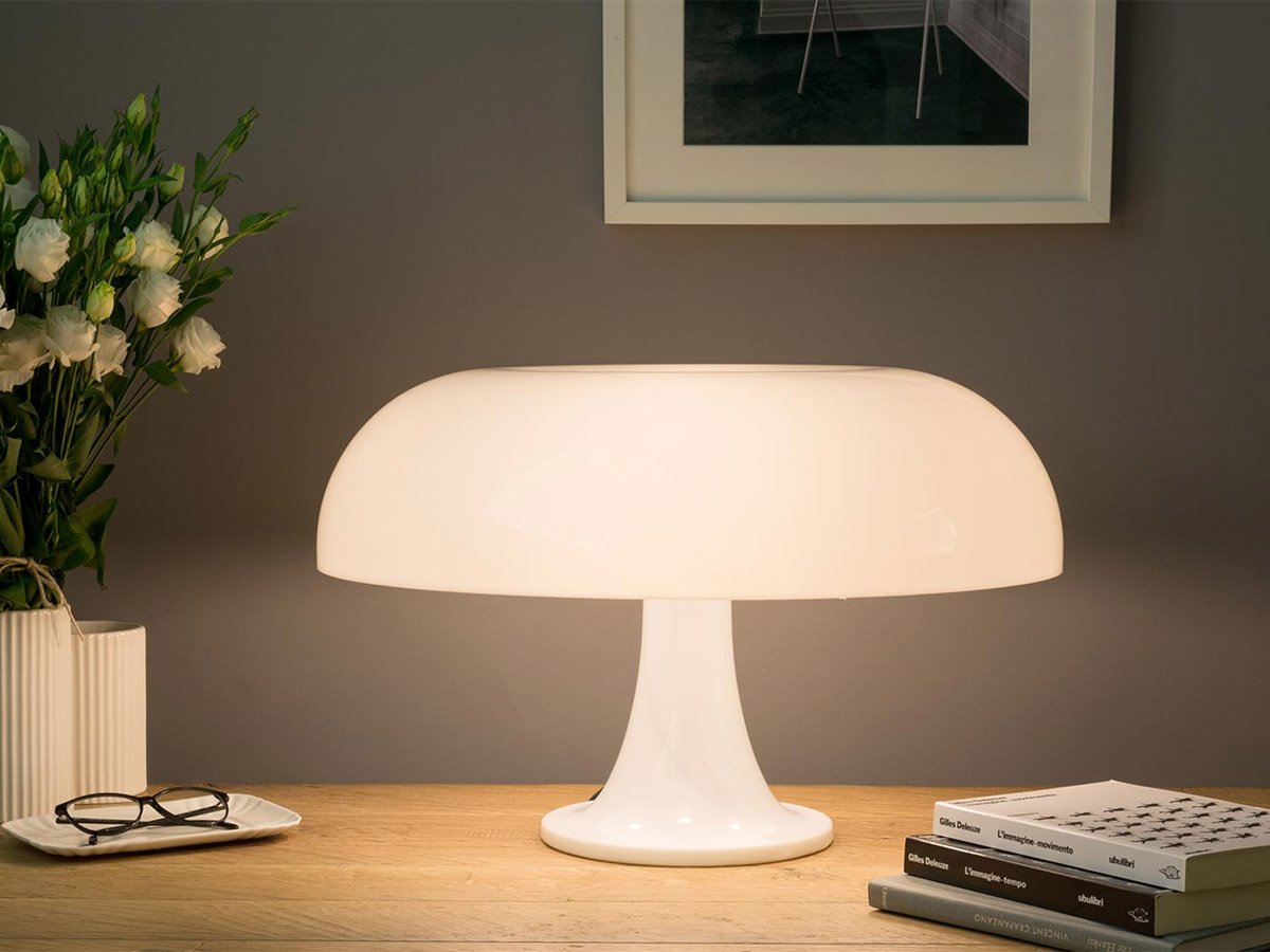 A symbol of futuristic and democratic design, the Nesso lamp by Artemide is undoubtedly a 1960s lighting icon, winner of the Studio Artemide/Domus competition. Famous for introducing ABS thermoplastic injection-molding, first presented in 1967, this elegant table lamp brings industrial materials and methods to residential and office settings. The soft, sinuous contours of the Nesso lamp, inspired by nature, take on a mushroom-shaped silhouette that directs and diffuses a homogeneous light downward into the space. Fascinating and with a slightly vintage aesthetic, it elegantly fits into any context, adding a touch of color and novelty: perfect to be placed on an entryway cabinet, on a bedside table in the bedroom, on a desk or even in contract environments and large work spaces. In its orange finish, Nesso creates a warmer, joyful and intriguing atmosphere, definitely original; in white it gives a touch of purity to the space, spreading an ethereal and enchanting luminous aura. Considered a true and valuable artwork, this mushroom lamp by Artemide is part of the permanent collections of the Metropolitan Museum of Art and the Museum of Modern Art.