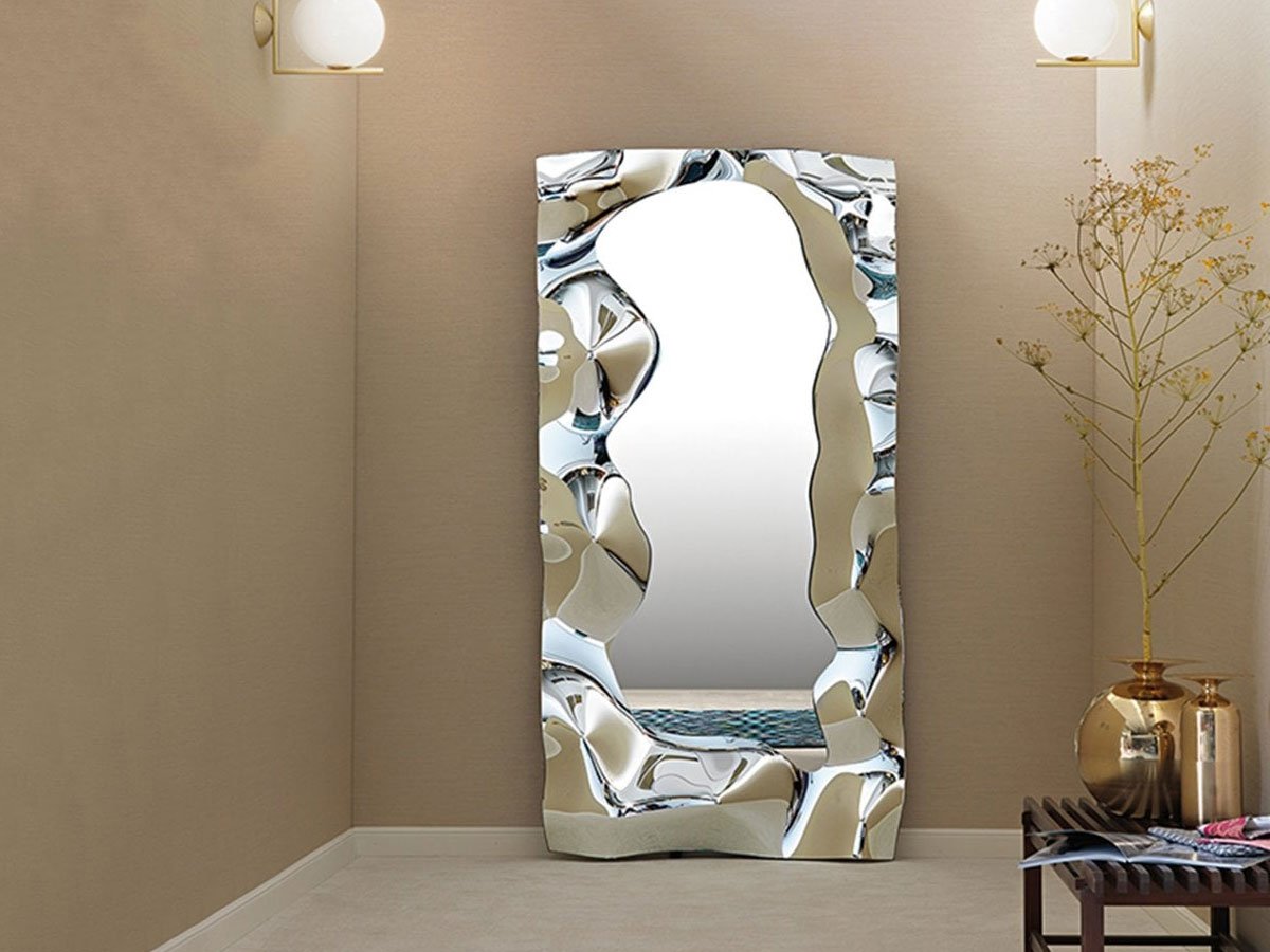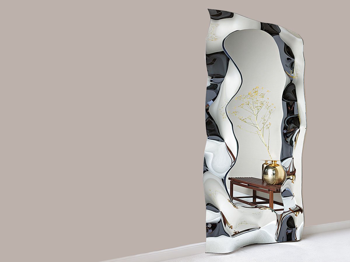 Phantom Mirror is a brand new design by Helidon Xhixha and Dante O. Benini - Luca Gonzo for the brand Fiam. Three models are available for this mirror with a strong presence and faceted reflections, due to the crumpled effect of the silvered frame that seems to blend with the walls on which it is placed.