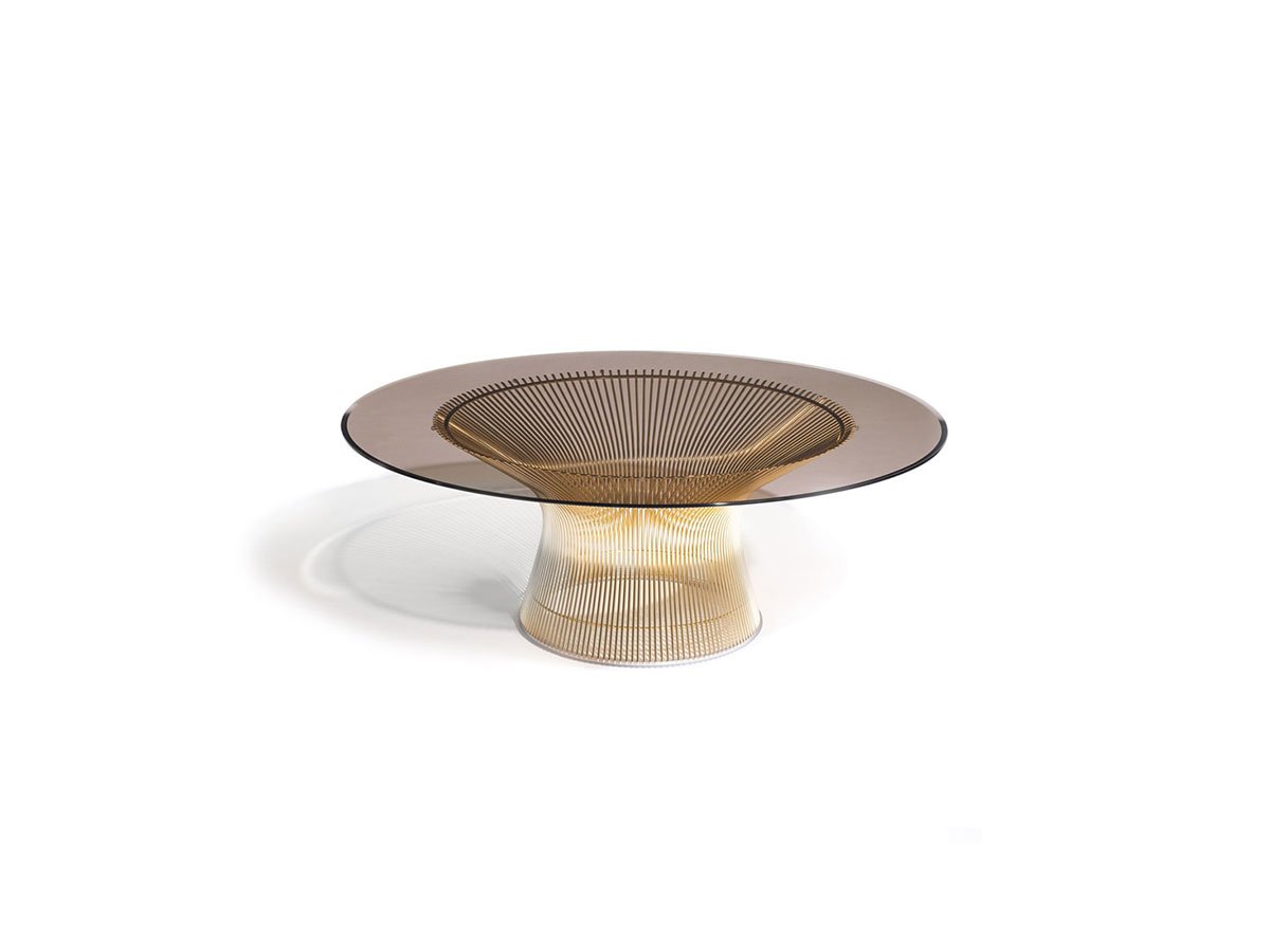 Designed by Warren Platner for Knoll, this coffee table is part of Platner Collection and has a 18 karat gold-plated steel wire rod base with clear lacquer protective coating while its top is available in clear 3/8" tempered glass, wood or marble.