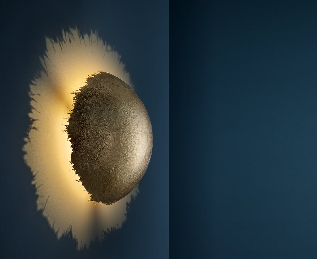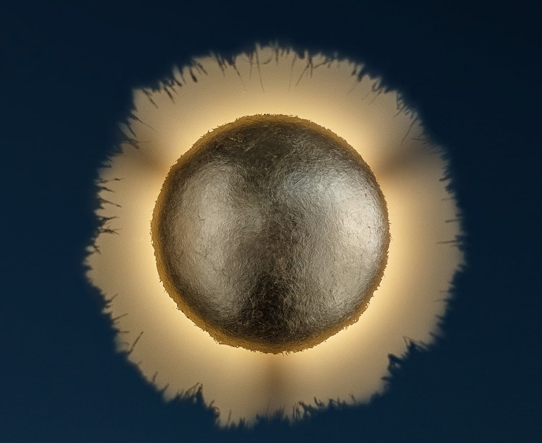Postkrisi is a very special collection of lamps in metal structure, hand-painted glass wool screen. This collection is made by the famous brand Catellani & Smith. Postkrisi is a very special collection of glass wool lamps available in golden leaf or in silver leaf. Each lamp is hand-painted and represents a high-quality craft object, as only Catellani & Smith can do.