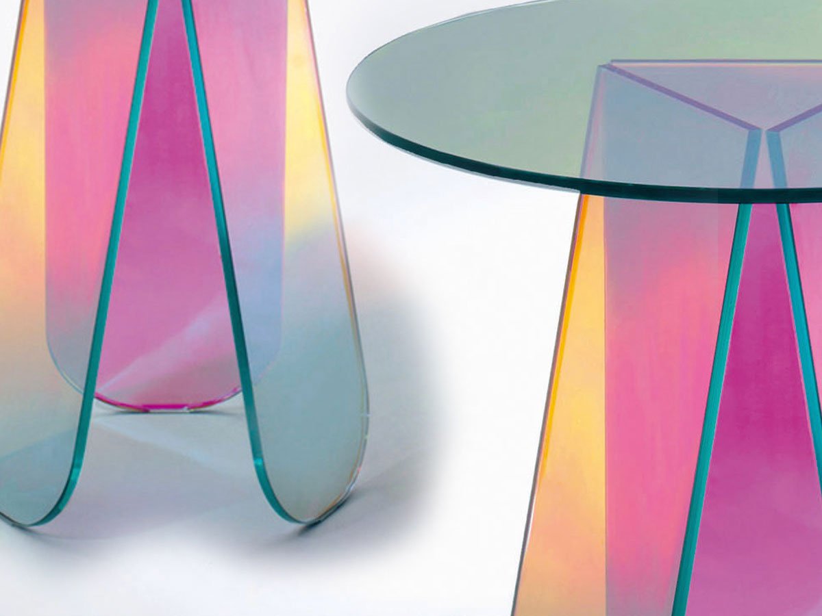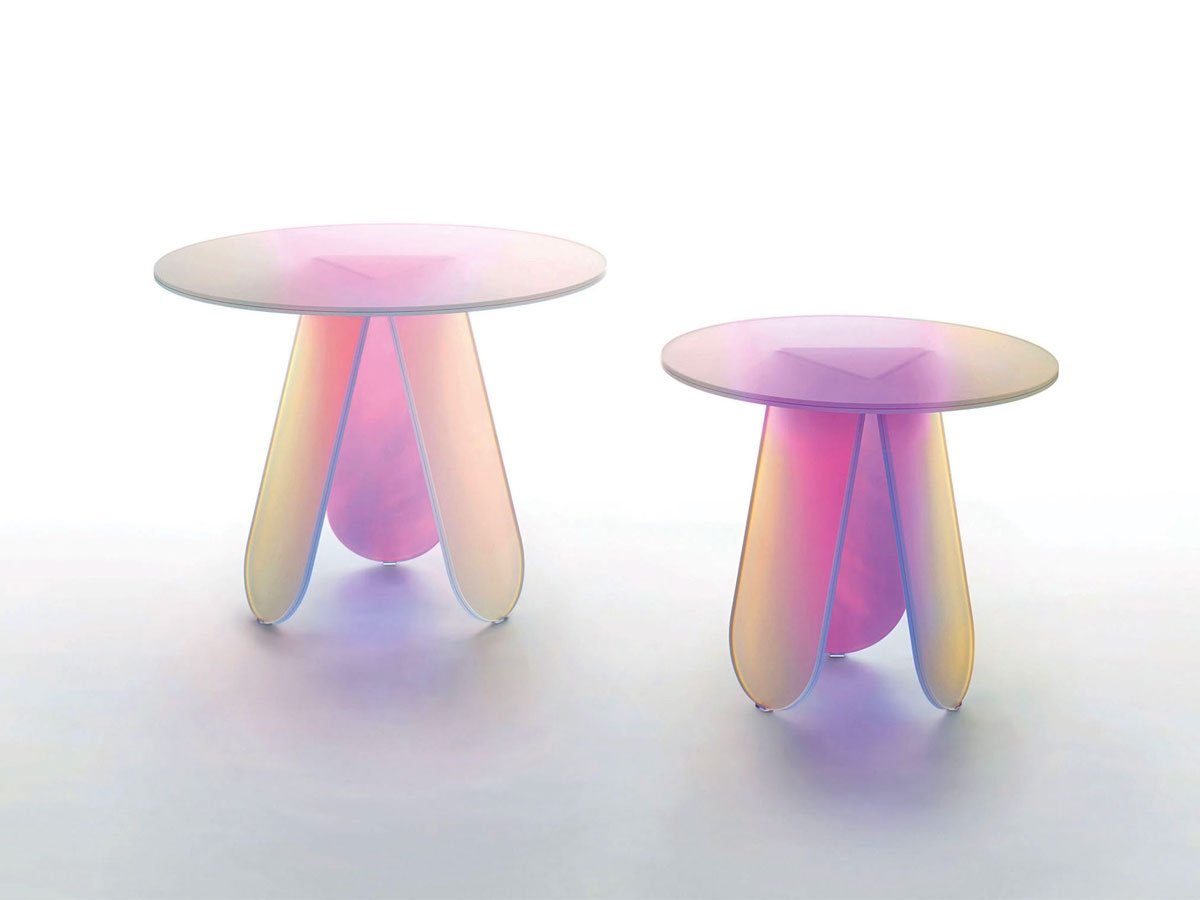 Patricia Urquiola creates round tables in laminated and bonded with a special iridescent finish multi-chromatic, the color of which varies depending on the angle of incidence of light and the point of observation. The result is magical and ethereal-looking objects.