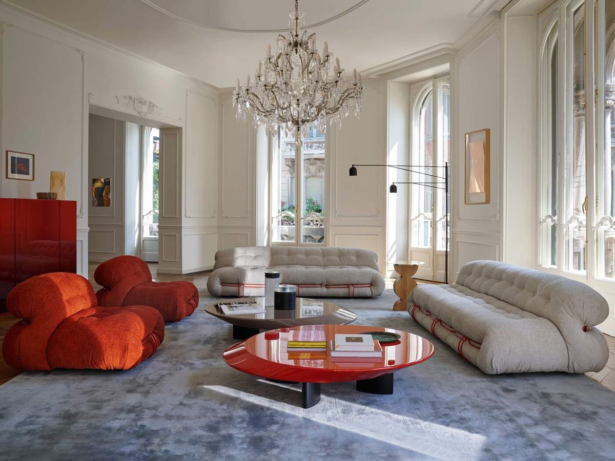Soriana is soft and abundant lines, with a generous coating fixed by a large metal clamp. Soft folds and sinuous curves are enriched by topstitching made with great craftsmanship. The Soriana series is available as an armchair, chaise-longue, two or three-seater sofa, and pouf, thanks to the Research and Development Center of Cassina and Poli design of the Politecnico di Milano the level of comfort is tripled and the original structure in polyurethane has been completely replaced by a series of bags filled with BioFoam microspheres, a patented foam with an organic base, while the seat has a blown fiber filling made from 100% recycled PET from Plastic Bank. Coatings and new colors for the metal vice complete this great re-entry into the Cassina family.