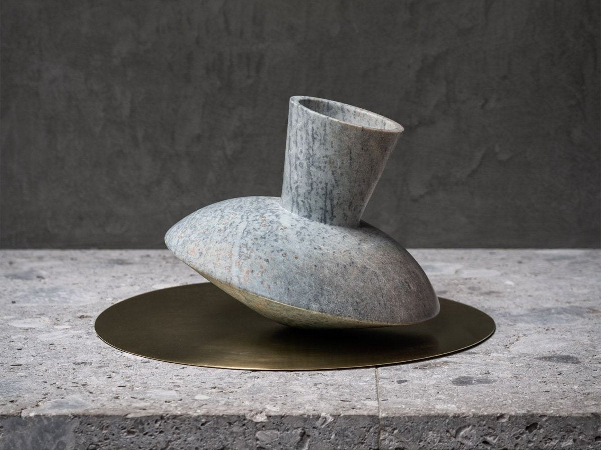 Distinguished by its essential and pure appearance, this vase, as well as the 01 version, is worked with soapstone, a natural material known for its variegated shades that range from beige to bright blue to silvery gray. The characteristic shape of the vases, supported by a thin brass plate, is inspired by a spinning top at rest, thus restoring a feeling of static elegance. The strong contrast between the roughness of stone and the lightness of metal represents the essence of Queiroz's work, which loves to harmoniously combine opposing elements. In the creation of Toll Vase 02, the Brazilian artist confirms her unmistakable style and love for nature, using a porous stone that, due to its characteristic, cannot be in contact with water or other liquids. A unique design piece for refined environments and lovers of contemporary minimalism.