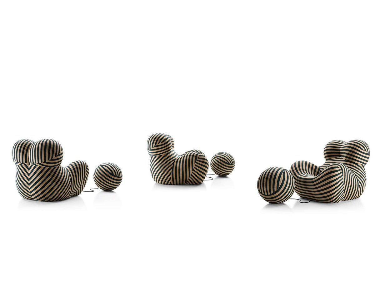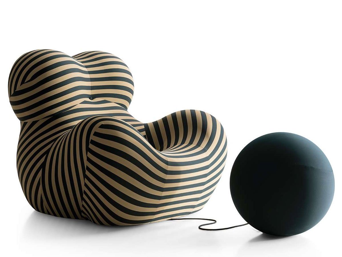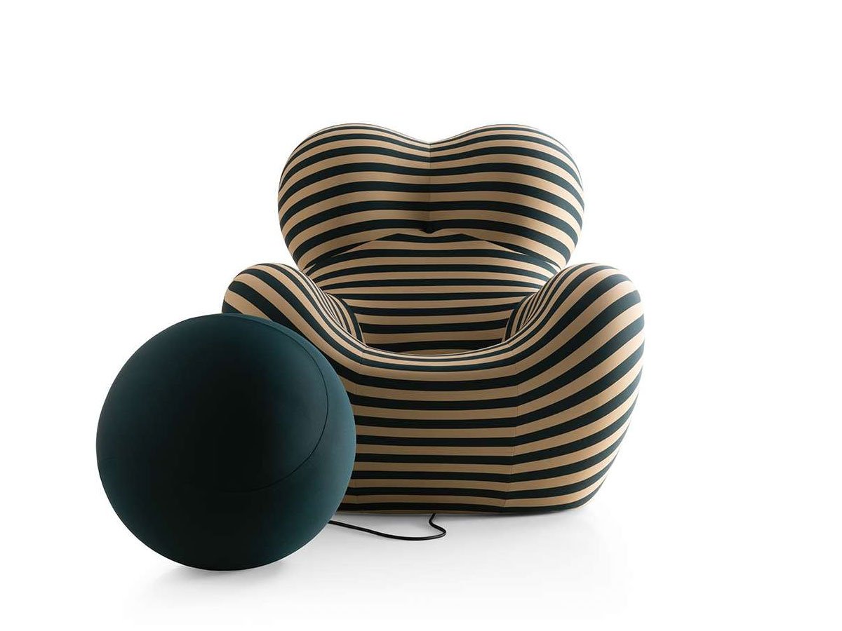 Up is an armchair designed in 1969 by Gaetano Pesce for B&B Italia, it is a legendary piece of design. The structure of this armchair and ottoman is in Bayfit® flexible cold shaped polyurethane foam. The coating, in elastic fabric, is not removable.Icon of modernity, Up armchair is characterized by an extraordinary visual impact that has made it unique. Combined with Up ottoman, it represents a female figure tied to a ball-shaped ottoman “symbolizing the shackles that keep women subjugated”. The curved lines and volumes link interior design to the spirit of pop art. Entirely made out of polyurethane and coered with elastic fabric, it is available in a variety of colors.Striped version for the 50th anniversary of the armchair