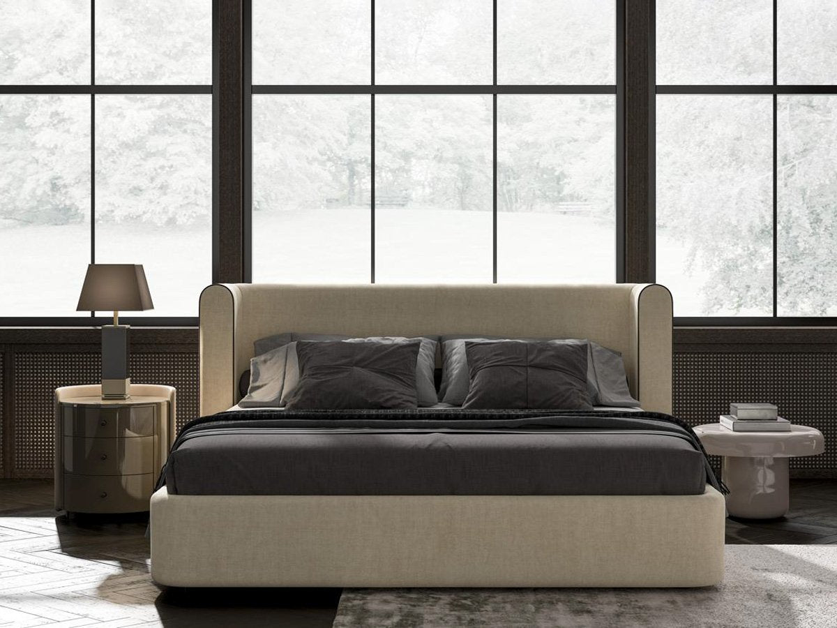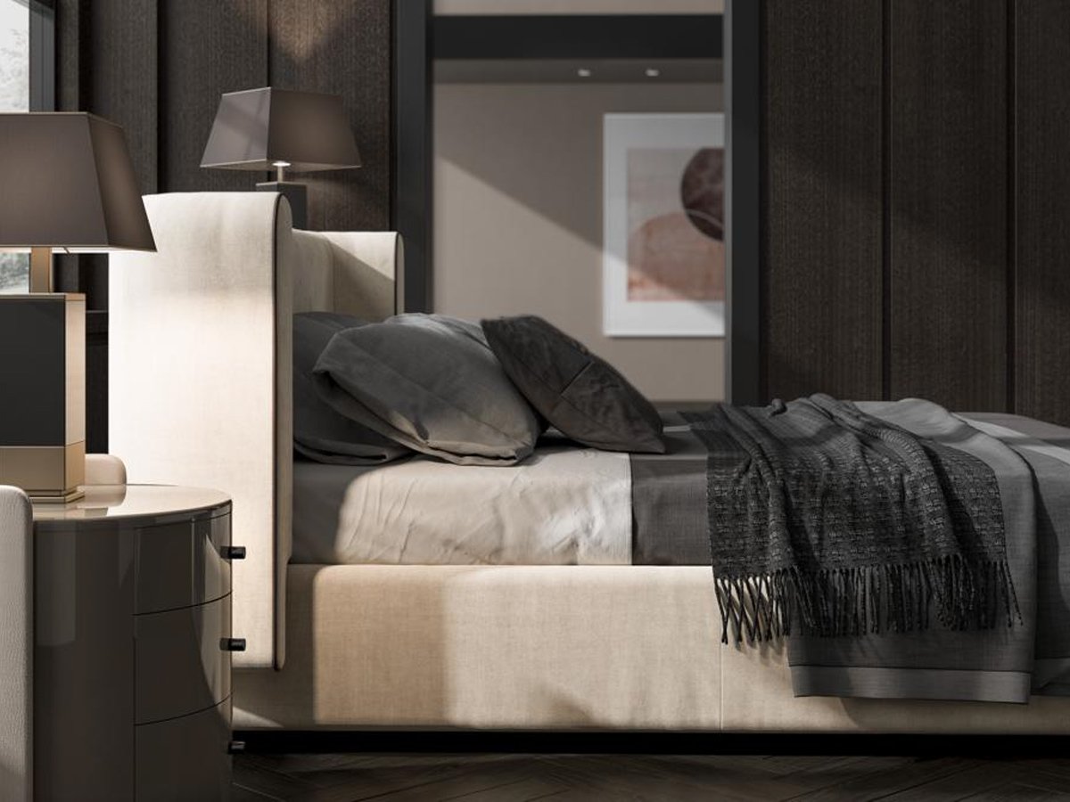 California special size bed with 183x203 cm bed base included. Headboard and bed frame in fir plywood with padding in differentiated density polyurethane foam. Black-colored edging. Concealed feet. In this version upholstery in A50 fabric. To discover other covers and customize Uptoyou with other finishes, feel free to contact our Customer Service Department.