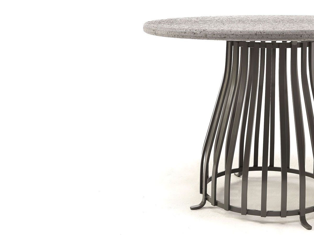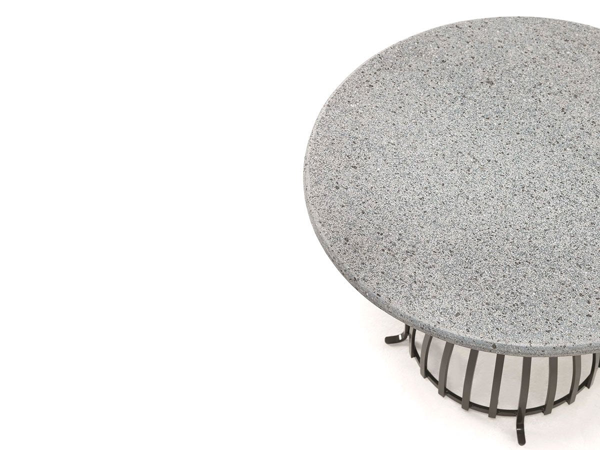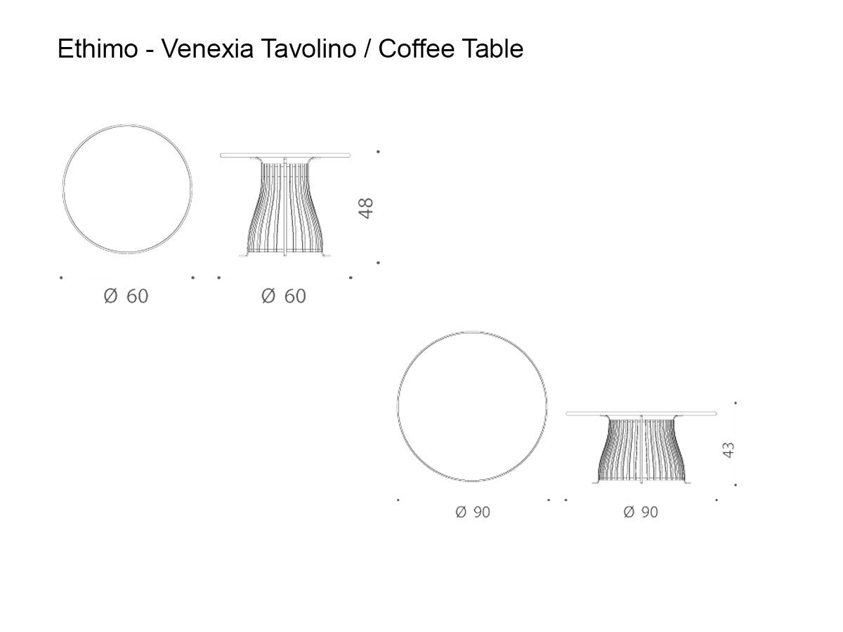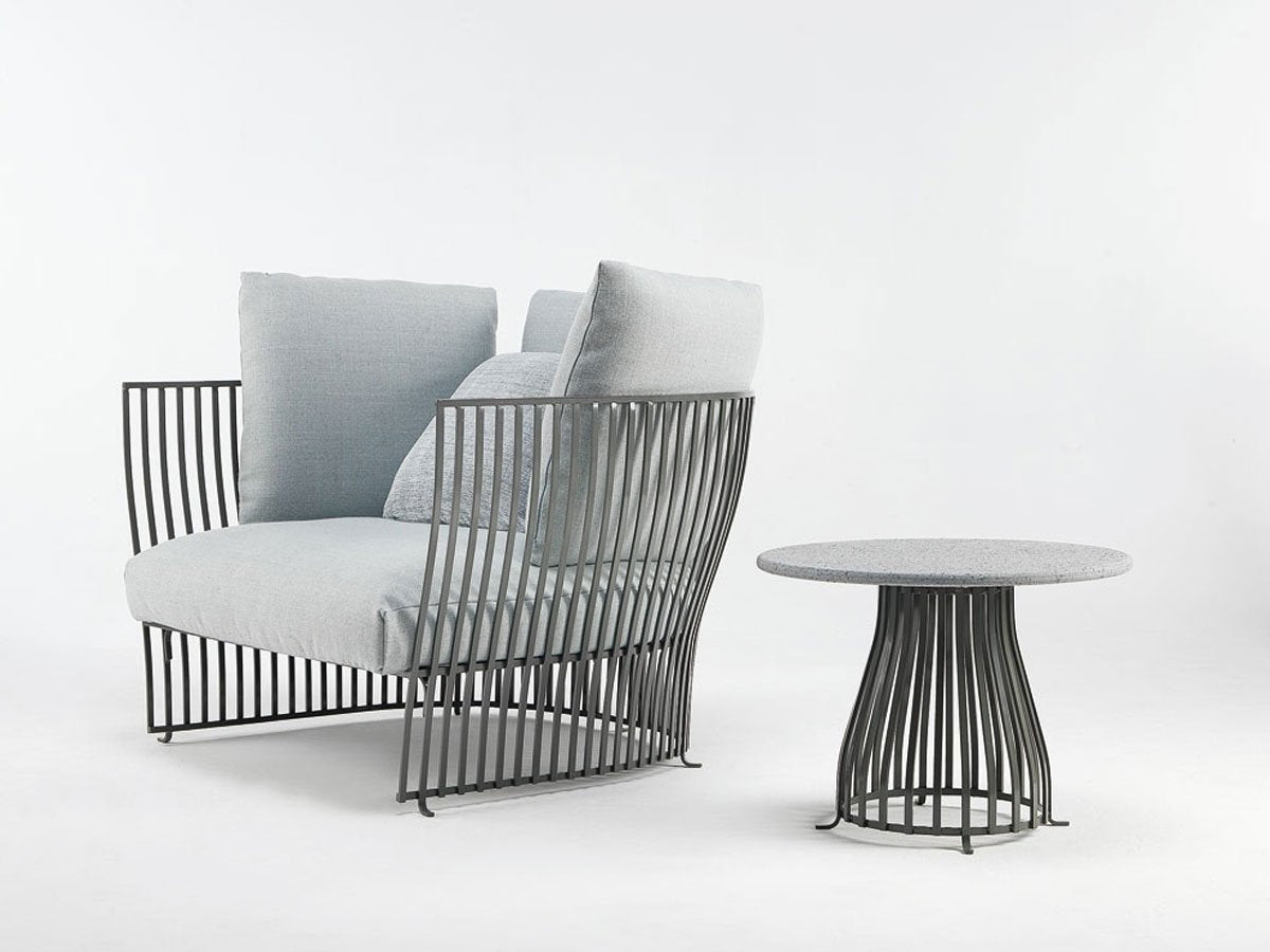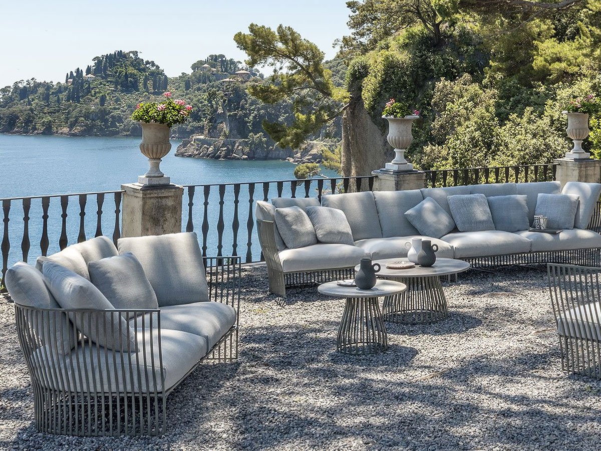 The Italian designer was inspired by the poetic image of the ancient railings of the late nineteenth century buildings; hence the structure of the sofa and armchair, entirely in aluminum, which envelops the rounded shapes of the seat and back, and which houses the soft cushions, made with recycled and waterproof materials, covered with outdoor fabrics. The effect is a comfortable sensation of lightness and strength. The coffee tables of the Venexia collection, on the other hand, maintain the aluminum structure of the sofa, which supports a top made of lava stone, glazed in white or gray.