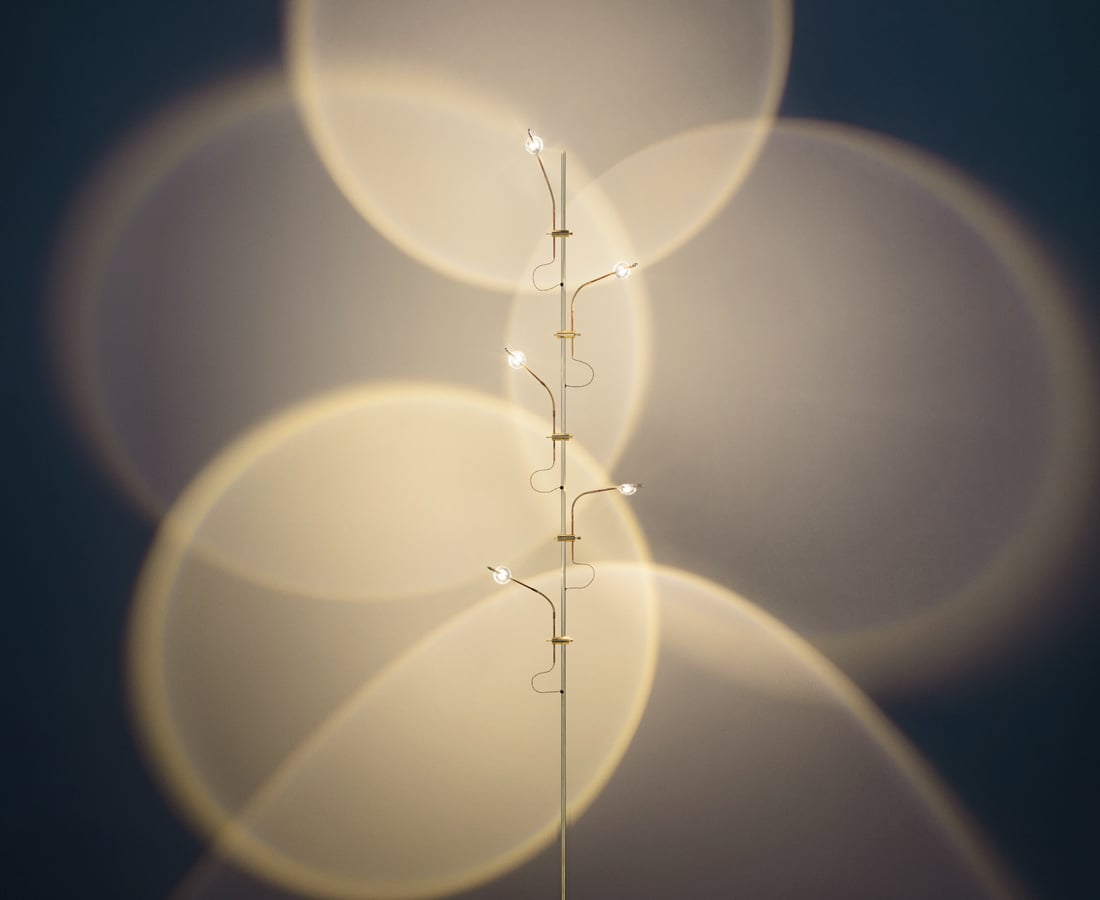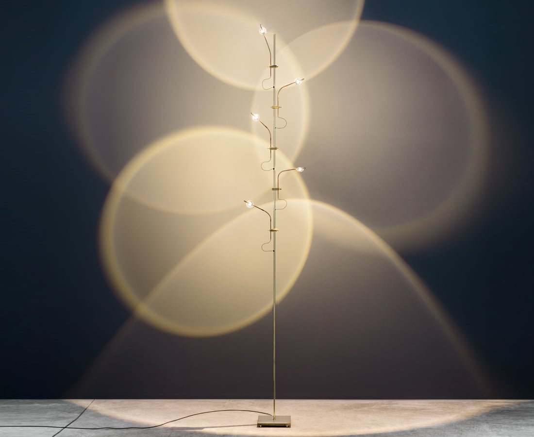 Wa Wa is a lamp that knows how to create warm and familiar environments, envelops you with its golden light and manages to decorate any type of environment with its beauty and its simplicity of lines and composition. It is made of brass base and structure, copper temples, removable glass lenses