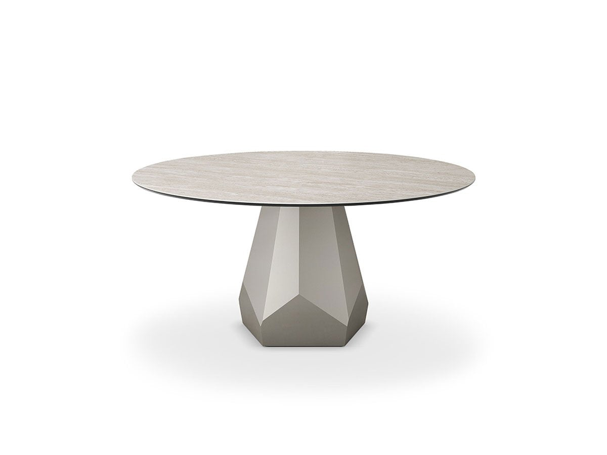 The Zermatt Keramik - Round Table's most striking feature is its central base, composed of fifteen precise geometric faces that captivate with their unique interplay of light and color. Each face of the pedestal reflects light in varying intensities, creating a dynamic visual spectacle that enhances its presence in a room. Available in ceramic and metal finishes, this table can adapt to a range of interior styles. Its size options ensure a versatile fit for different spaces, whether as a centerpiece in a spacious dining room or a stylish addition to a more intimate setting.